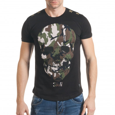 Περιγραφή και Υλικό Ανδρική μαύρη κοντομάνικη μπλούζα SAW, slim fit, αστέρια, κρανίο, πριντ, στρογγυλο ντεκολτε.